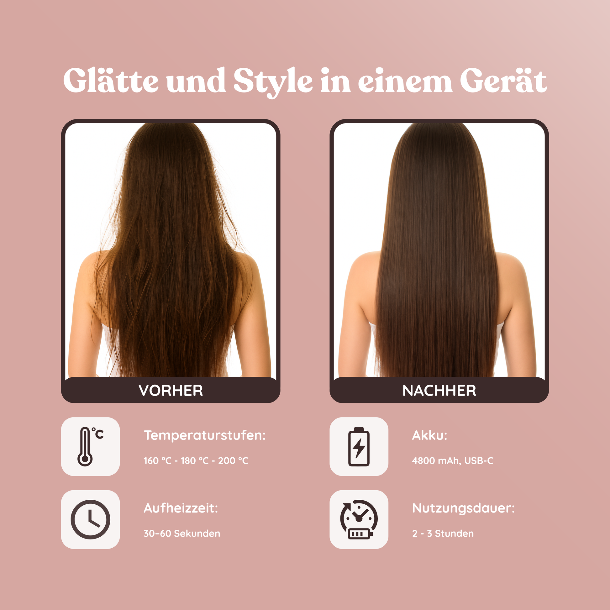 Adelgard F. 01.09.2025Verifiziert von FORGLOWDie Haare sind so schön glatt.Ich nehme das Glätteisen morgens mit auf die Arbeit falls ich abends noch einen Termin habe und es ist so unauffällig. Der Akku hält bei mir sogar mehr als drei Stunden.